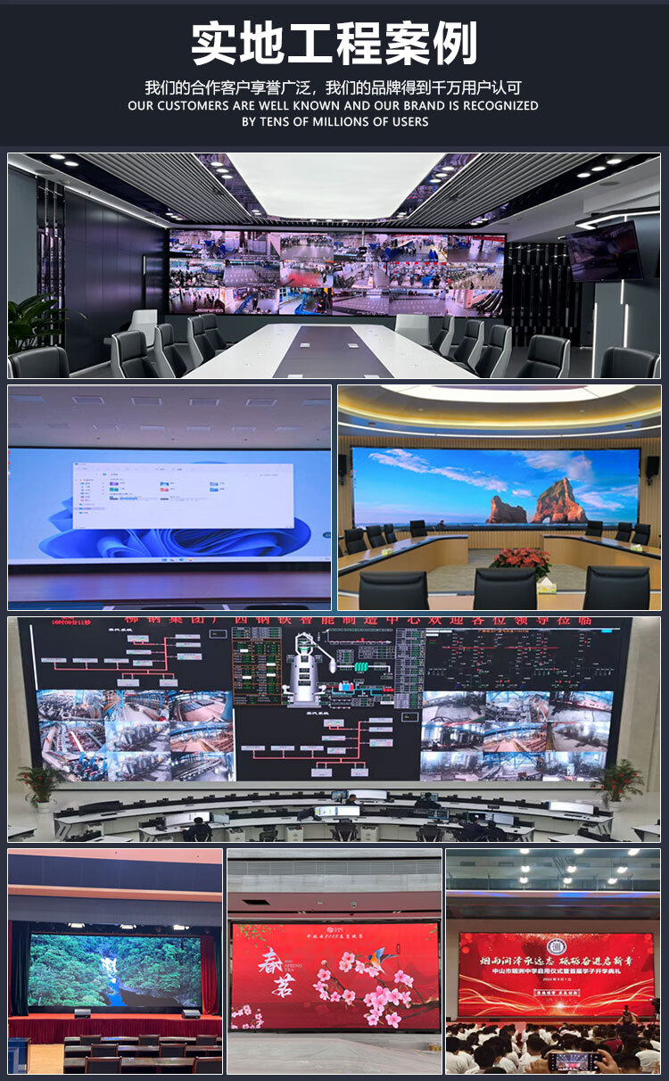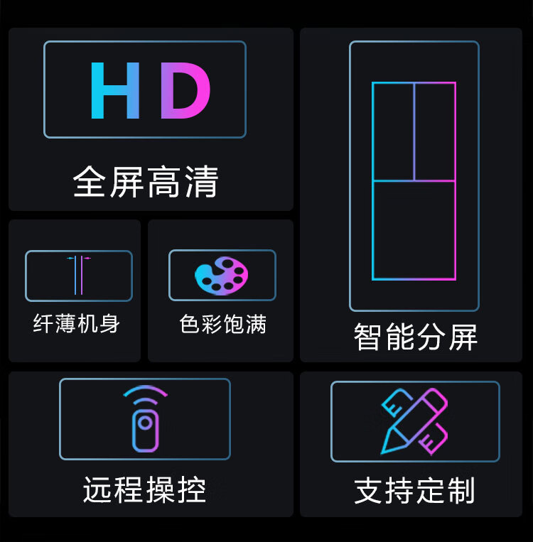 拼接屏的前维护主要是之支架是前维护的,维护时推拉支架即可从方维护前维护方式一般采取在大屏幕前面将屏幕摘下,之后对其进行维护;这种维护方式的大屏幕安装非常复杂,而且只能做两层大屏拼接;同时,由于要为从前面摘除大屏幕留出余量,将导致大屏幕拼缝不可避免的变大,从而会在一定程度上影响显示效果。